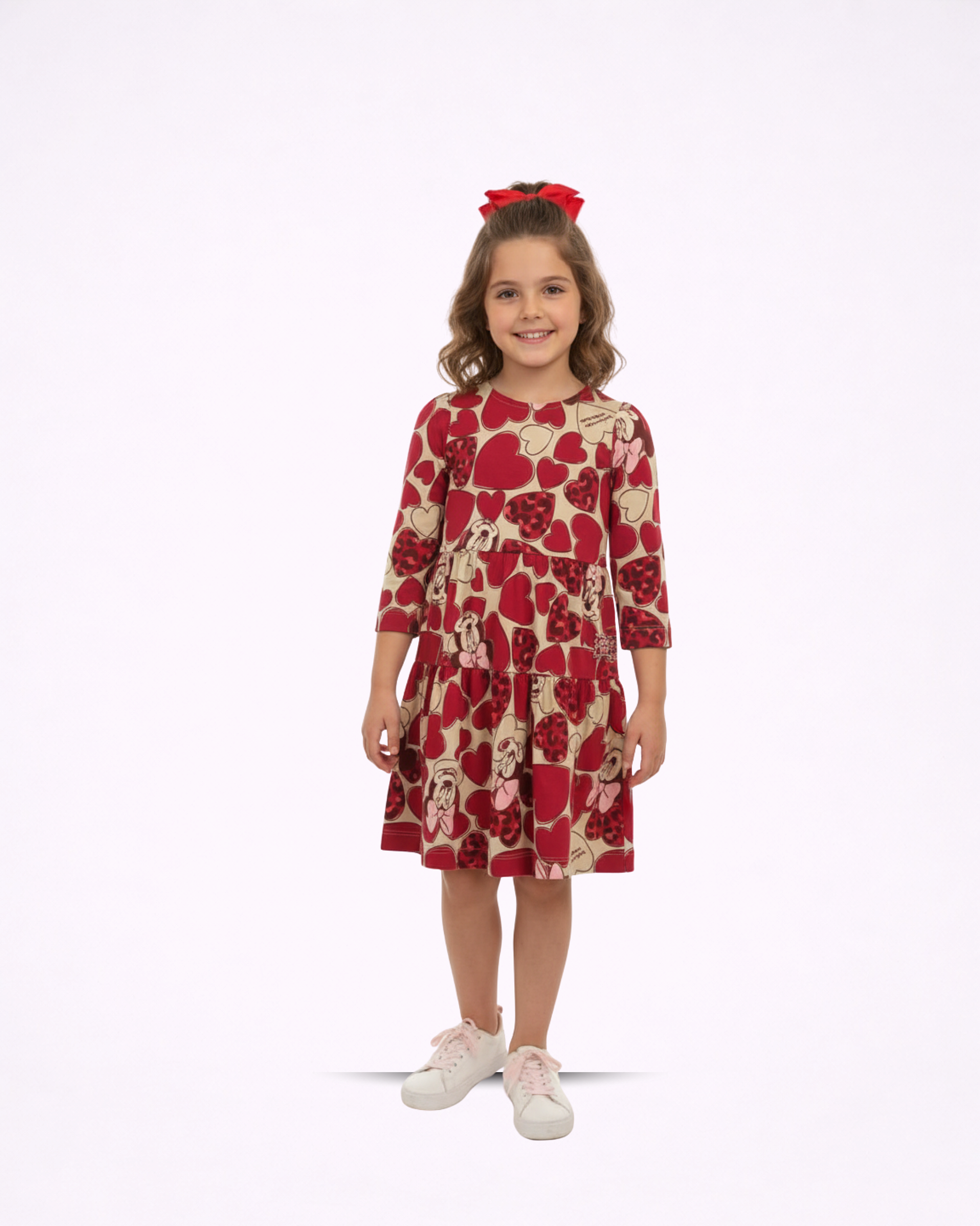 Vestido infantil com estampa encantadora de corações, trazendo um visual alegre, romântico e cheio de personalidade para o look das pequenas.