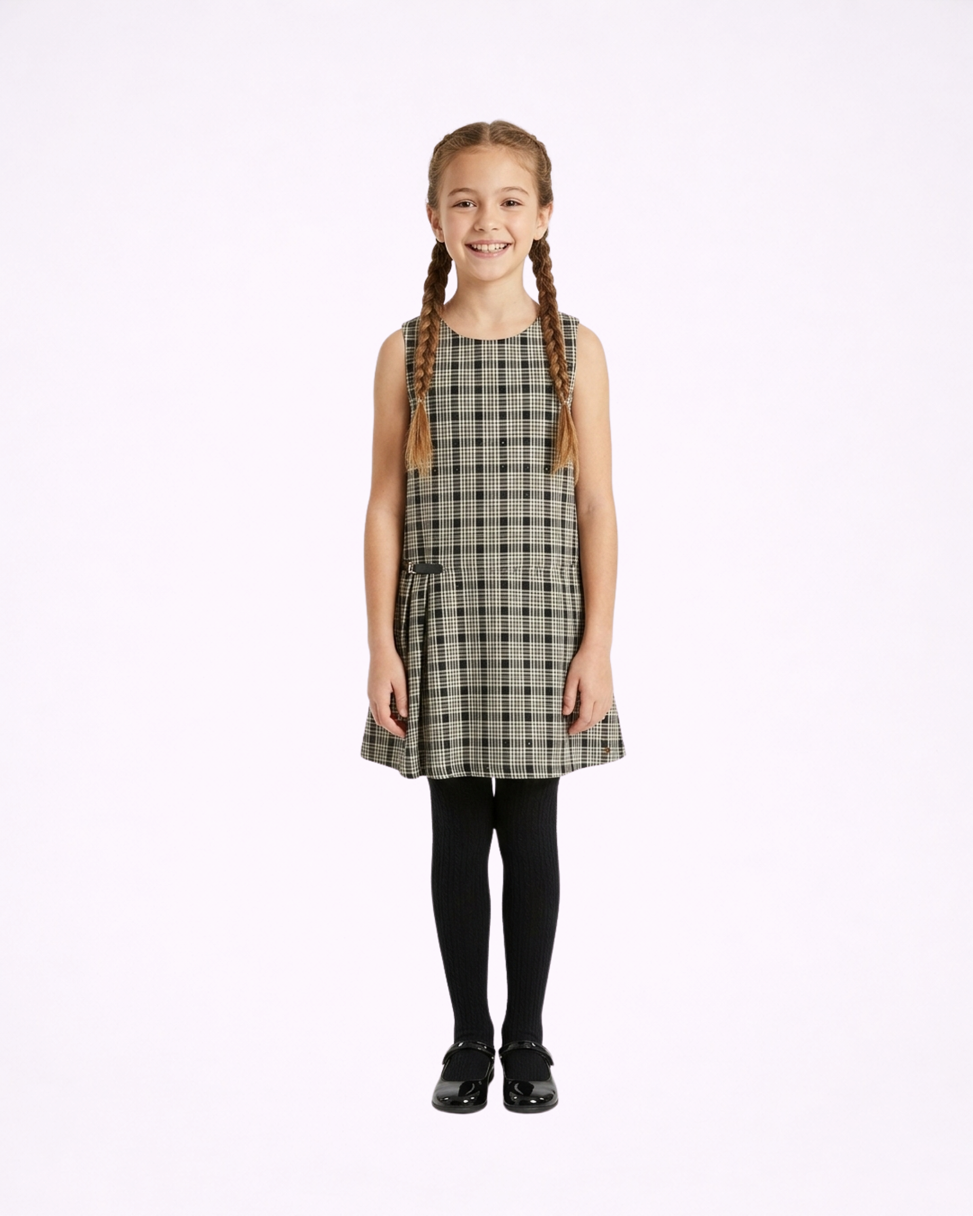 O padrão xadrez em tons neutros confere charme e versatilidade, enquanto o pequeno detalhe frontal acrescenta um toque de modernidade ao design. O vestido combina perfeitamente com meia-calça e sapatos clássicos, criando um look elegante e confortável para as pequenas.